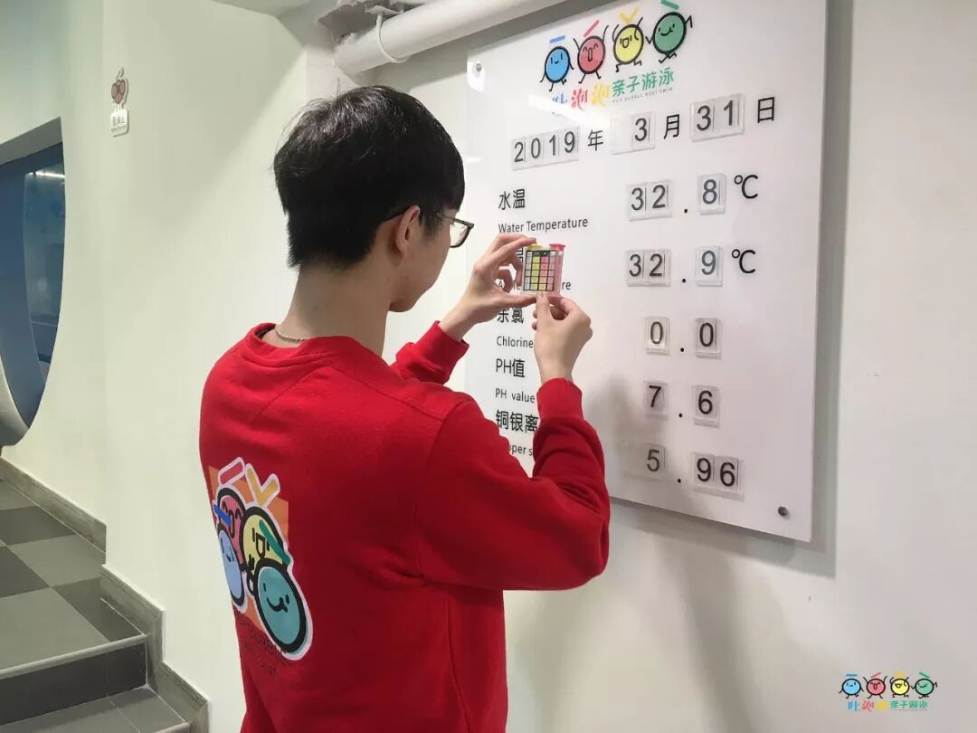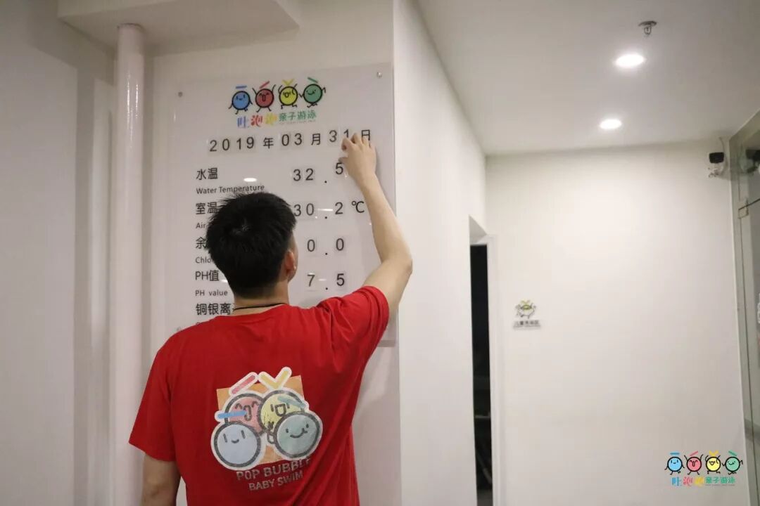 吐泡泡除了定期邀请专家对我们的水质进行抽样检测外,教学部每天也都会进行自检,并且把所检测到的数据公告对外。水质是保证亲子游泳安全、舒适的重要因素,必须严格执行、把关,对所有的会员负责。