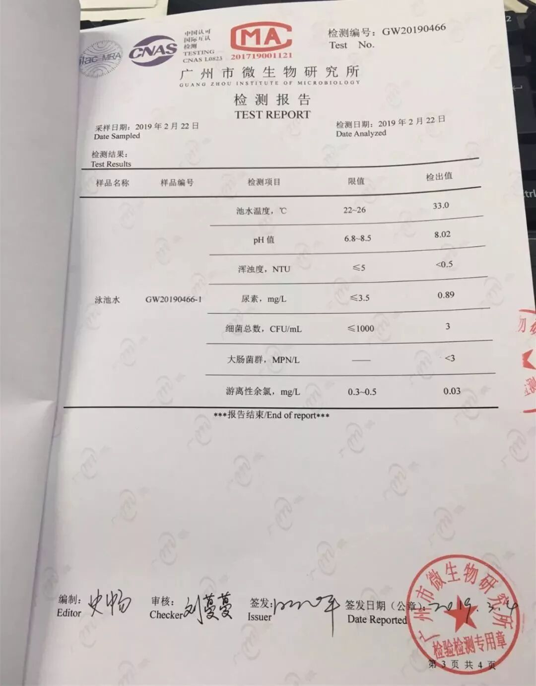 对吐泡泡更换池水的前一天水质进行了抽样检测